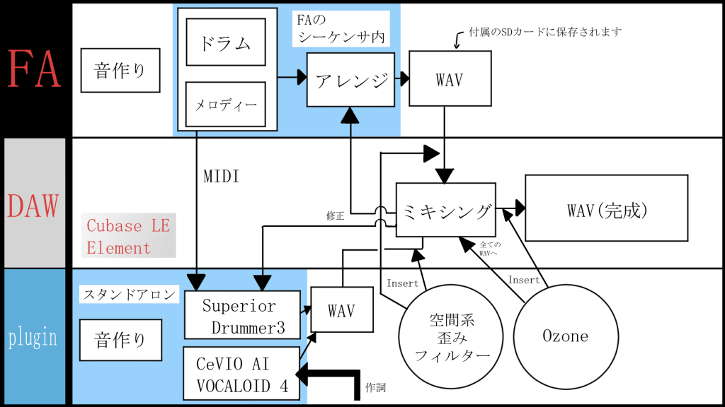 FAとプラグイン(スタンドアロン)で音色を作りWAV化、DAW上で混ぜる。といった流れになっています。
