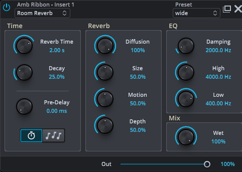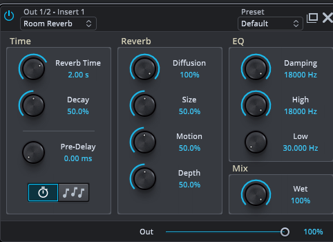 アウトプットにroomリバーブを刺しました。今回は図中のReverb項目については触れない・ディレイをかけないです。変えるのはTimeとEQです。IQ1でもできることですし、皆様も一度は通った道ではないでしょうか。