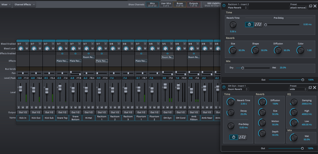 リバーヴはEQと違って聴かないとわからない、聴いてもわからないという曲者です。なので設定と音源を見せながら変化を可視化していこうと思います。また、全体的に音を鳴らせる上にわかりやすいものとしてドラムの音源を使っていこうと思います。使用するのは相変わらずSUPERIOR Drummer 3です。付属EQを使ってますが、どのリバーヴでも同じようなパラメータが大体存在するのでご容赦ください。