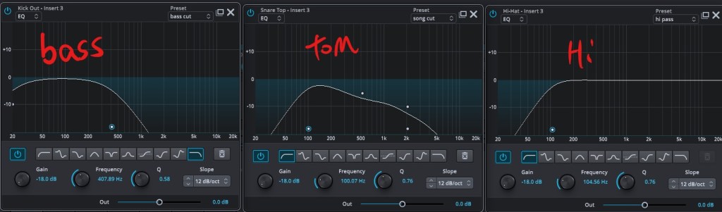 リバーヴの後にもEQを刺しましょう。手順は前回のEQの解説と同様です。しかし、1kHzと2kHzにノッチフィルターはかけないです(あらかじめ削られている前提)。これのかかり具合もお任せです。ですがローカットとハイカットを忘れるとリバーヴでモアっとした印象を生む原因になるので気を付けましょう。