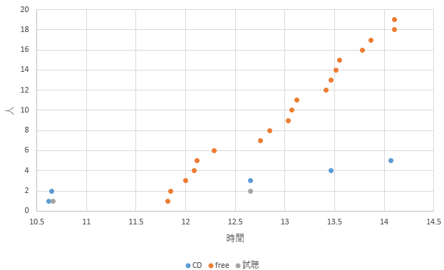 知見をいくらか加えて書く。CDを手に取る人よりも試聴をしてくれる人の方が少ない(視聴コーナーなどで聞いている可能性はある)。視聴によって購入を決める場合もある。無料配布はそこそこ手に取ってもらえる(また、それによって興味を持ってもらえる)。実際、無料配布のデータからは傾向を感じることができる。次回からはサークルの前を通った人の数も集計したいと思う(さすがに手作業は無理なので適当にセンサーでも買う)