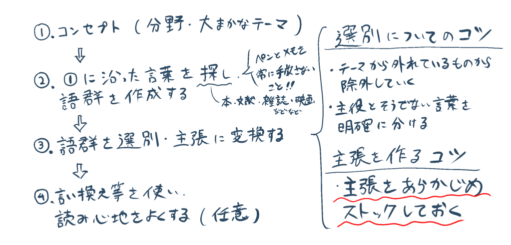 一方で、語群を作ることも最重要事項です。語群作ることによって語群内の言葉同士で意味を作ることがあります。それがコンセプトになり、短文を作るきっかけになります。語群を作るにあたってコンセプトを用意する必要があるので注意。