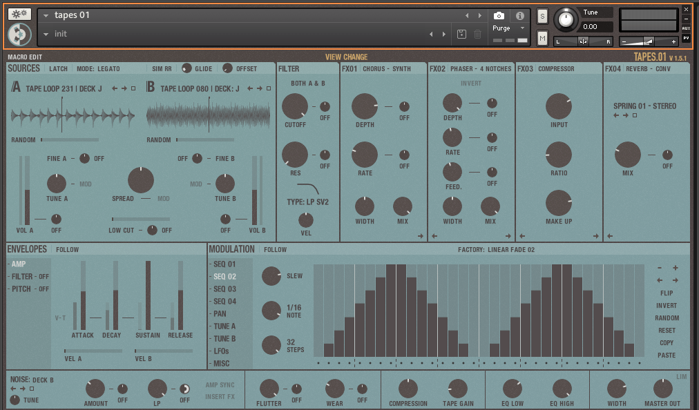 今回はTapes.01というプラグインを購入しました。ノイズ・シンセサイザー・エフェクターが一緒くたになったプラグインで、当然いろいろできます。嬉しいことに内臓音源が充実しています。使い勝手がいい……って感じではないですが、手軽にIDMを始めるには非常に良い者かと思います。楽曲ではプリセットの中の一つを使用しています(大幅に加工していますが……)。値段もそこまで高くはないですし、そこそこおすすめ。